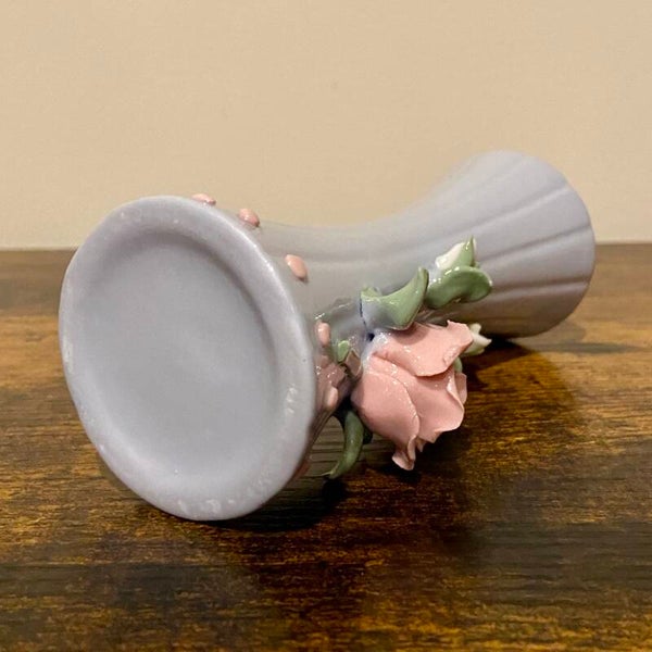 Light wedgewood blue coloured soliflore vase with delicate pink rose looks like it is straight from the top of a cake. This vase is in good condition with normal wear but no chips or cracks. Any imperfections are in the glaze itself.