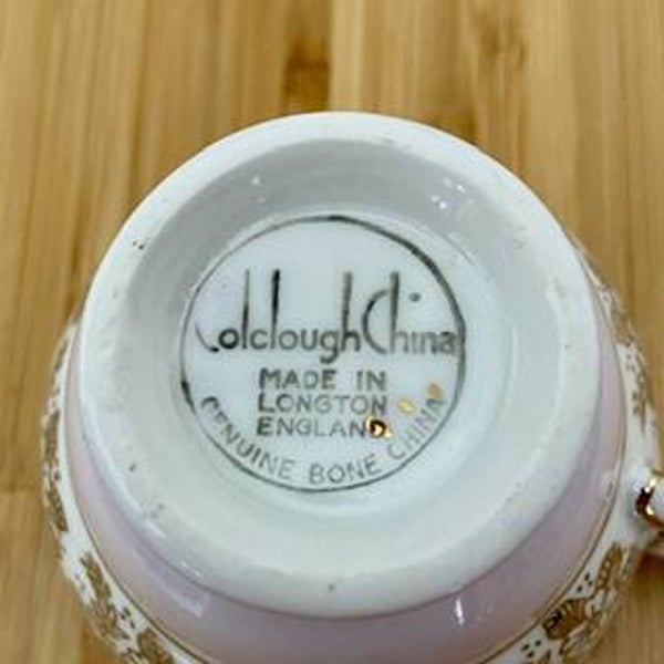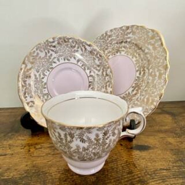 This beautiful pink teacup, saucer and side plate trio has gilt lace detail. Made in Longton, England it has the Colclough factory stamp which dates it to 1939-1954. There are no chips on these items but there are signs of usual wear as expected for items of this age.