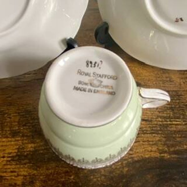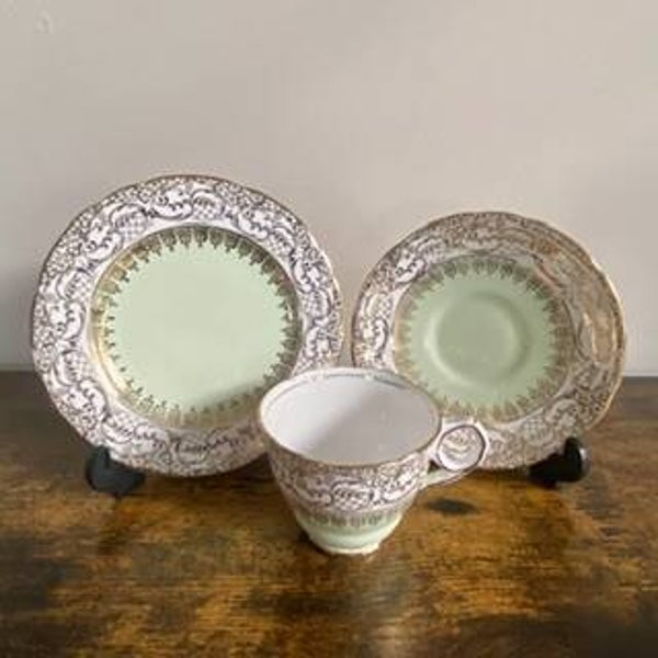 Beautiful gold and green tea set trio. Genuine bone china made in England for Royal Stafford.
