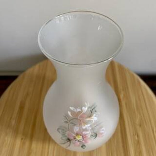Beautifully delicate frosted glass vase decorated with cute pattern of flowers. There are no chips or cracks, normal wear shows on this well cared for vase.