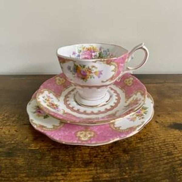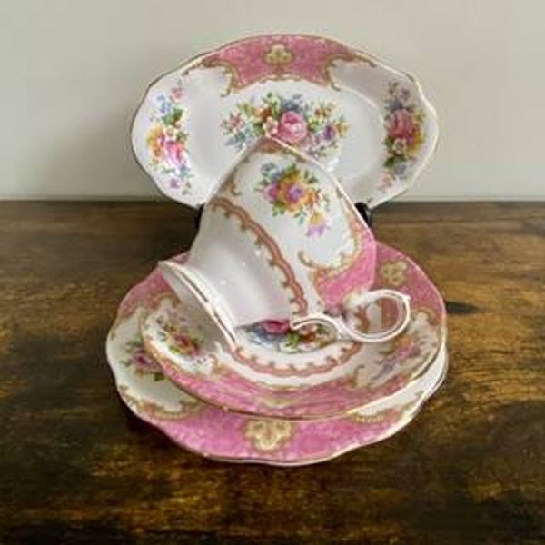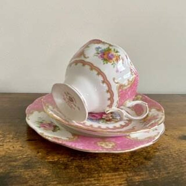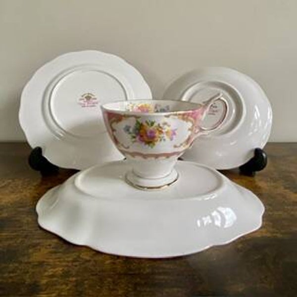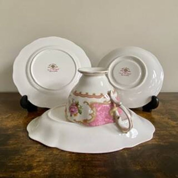 beautiful and delicate white and pink tea set trio with gold rim plus a bonus side plate